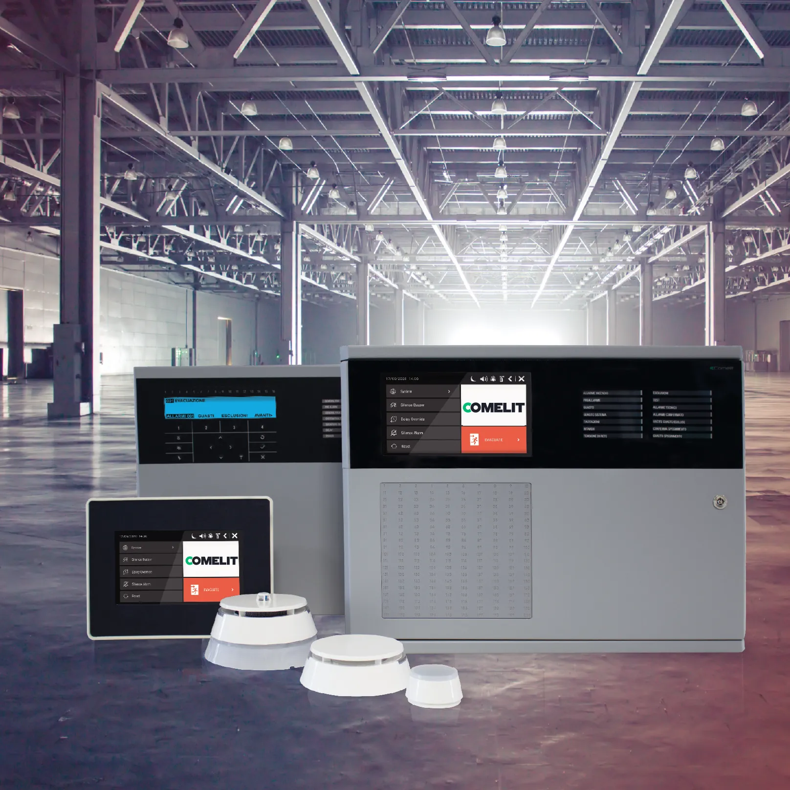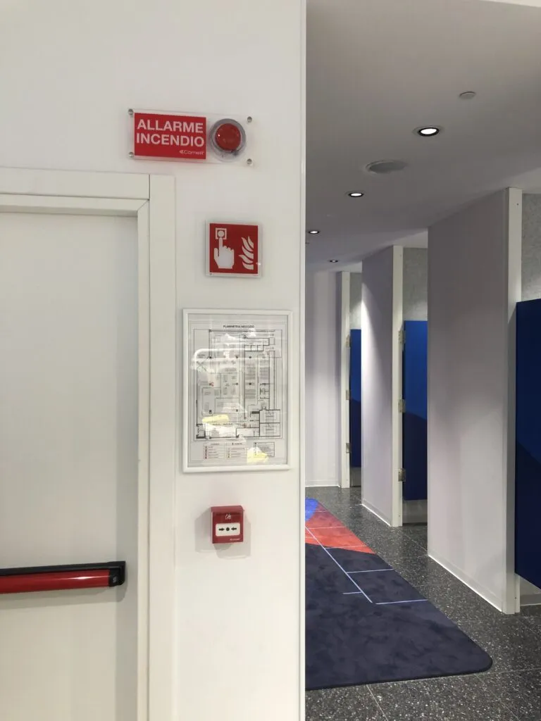 Plusieurs points d'ancrage au plafond, des boutons de détection manuelle, des panneaux acoustiques optiques et une centrale d'alarme incendie de la série LogiFire.